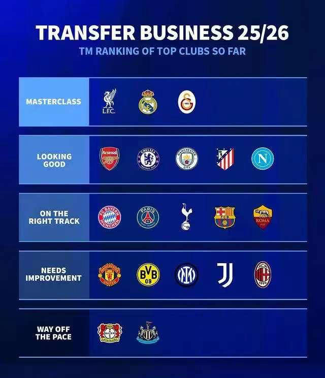 被列为“需要改进”的球队包括曼联、多特蒙德、国际米兰、尤文图斯和AC米兰。尽管这些球队在转会市场上存在各种问题,但是夏季转会窗口尚未关闭,他们有时间进行调整和完善。而被认为“走在正轨上”的球队,则包括拜仁慕尼黑、巴黎圣日耳曼、热刺、巴塞罗那和罗马,这些球队的阵容大部分已经基本确定,通过夏季转会窗口补强部分位置,保证了球队的实力。